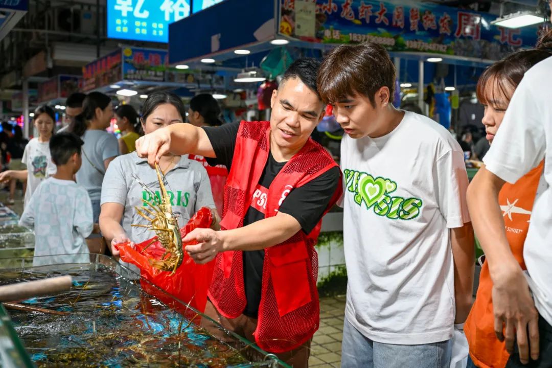 跟着重庆小夫妻走进海鲜市场时,身穿红马甲的工作人员快步迎上来的热情招呼、摊主挥着渔网“少一两赔十斤”的爽朗应答,早已冲淡了游客攥着攻略的拘谨。加工区里,餐桌周转得很快,刚收拾干净就摆上新餐具,厨师灶前的火苗“噌噌”往上蹿,处处透着热闹。最难忘的是老板带顾客挑皮皮虾的场景,他捏着虾背逐个翻看,细致讲解“三条白杠是带膏的”,那脸上的热情——哪是做生意,分明是把远方的客人当成朋友在尽心照料。