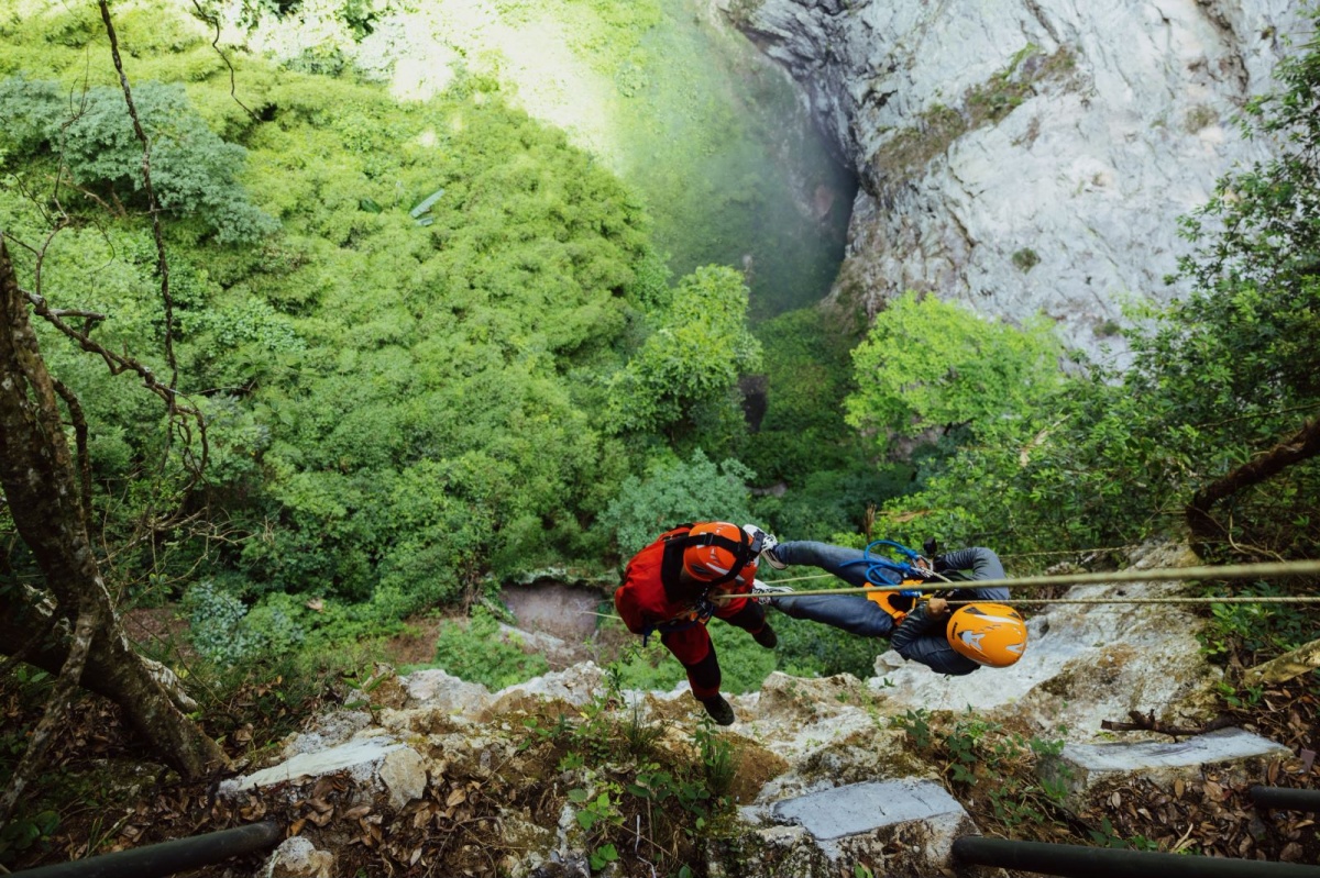 游客在风子荡天坑体验速降。乐业县文化体育广电和旅游局供图