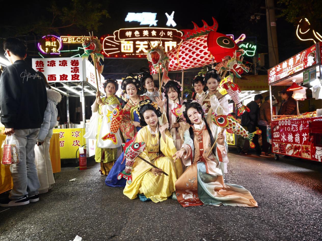 2025年12月31日至2026年1月3日,南宁市西关夜市举办“年年有鱼·灯耀西关”主题活动。活动以寓意吉祥的“鱼”为意象,组织身着全套汉服、精心妆造的演员手持鱼形灯饰,在夜市街区开展巡游展演。流动的灯火与典雅服饰交织,为岁末年初的街巷增添了一份别样的节日韵味,吸引众多市民驻足观看、拍照留念。