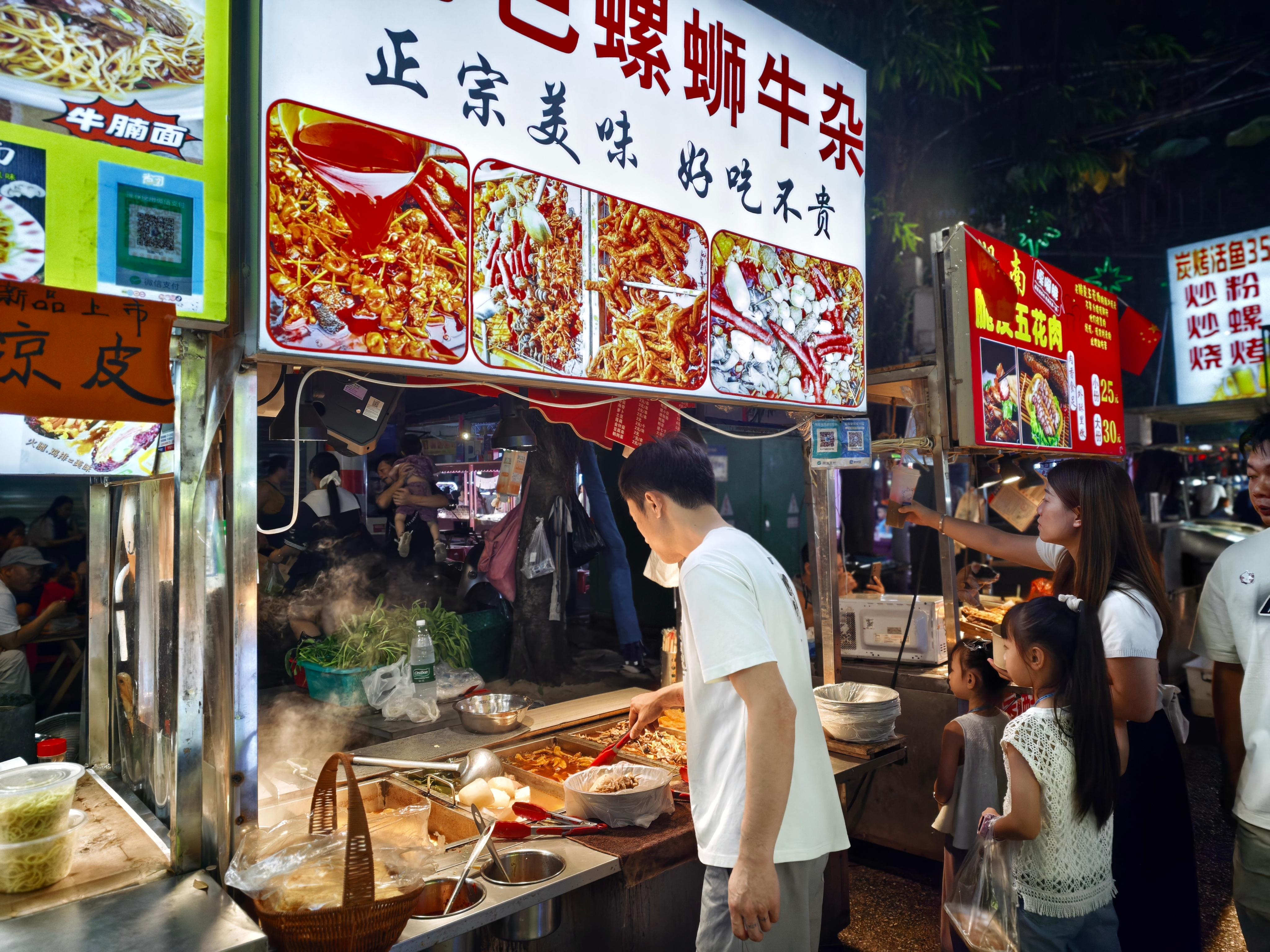 漫步夜市,石板路的纹路里还嵌着旧时的脚印,霓虹灯下的摊位延续着往日的热闹。西侧的小商品区藏着平价惊喜,东侧的美食区抚慰辘辘饥肠,涂鸦墙与骑楼古建相映成趣,新与旧在此毫无隔阂地共生。这里没有刻意雕琢的打卡点,却每一步都踏在记忆里:和平商场的繁华延续着"广西小义乌"的传奇,街角的修鞋摊仍有邕宁阿姨的热情招呼,而那些流动的小吃摊,依旧保留着"酸野串签、汤汁淋漓"的地道仪式感。