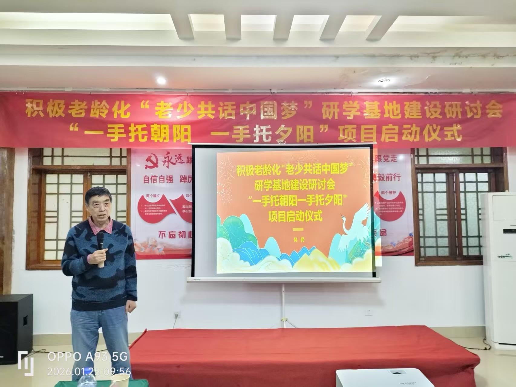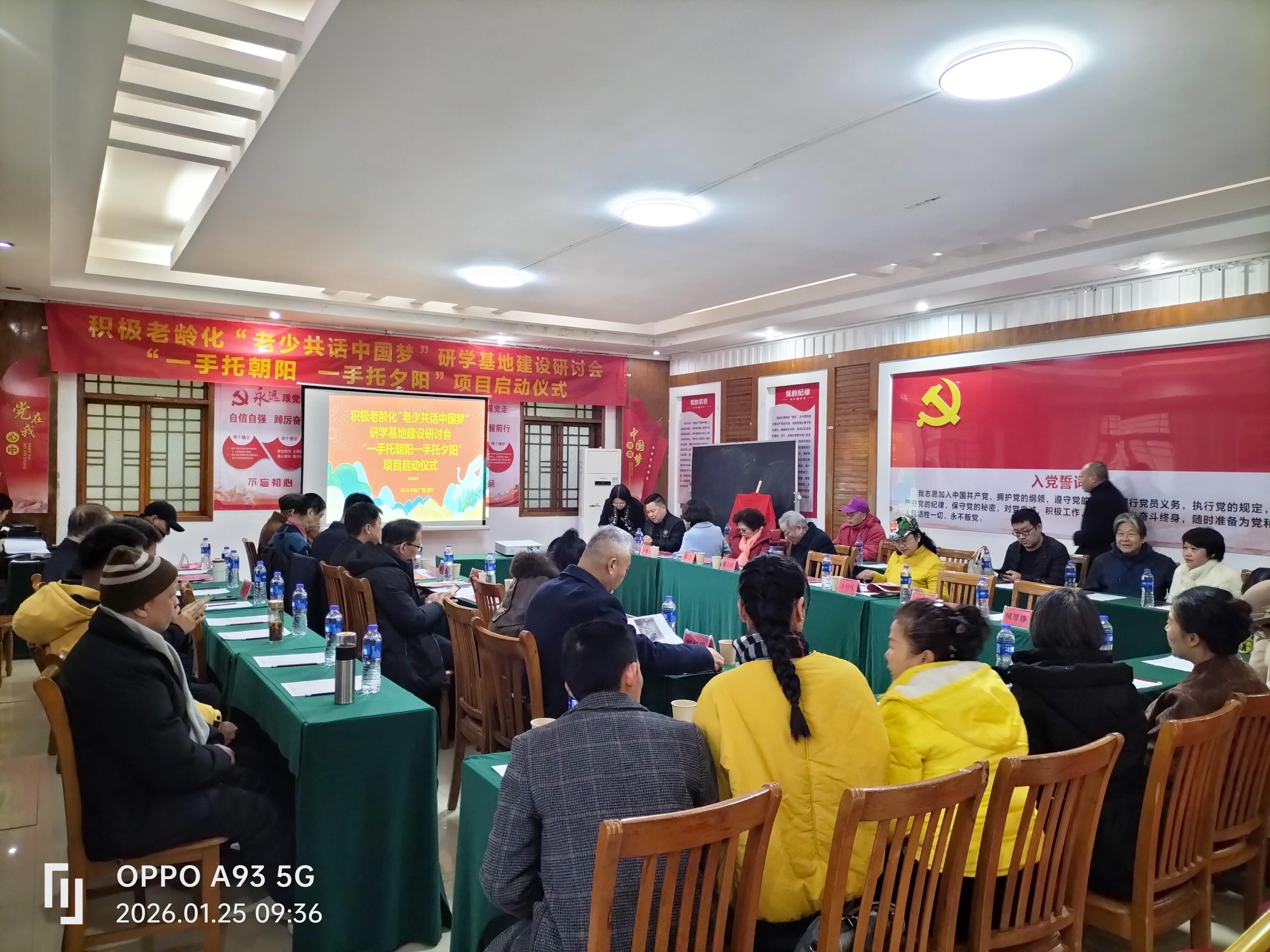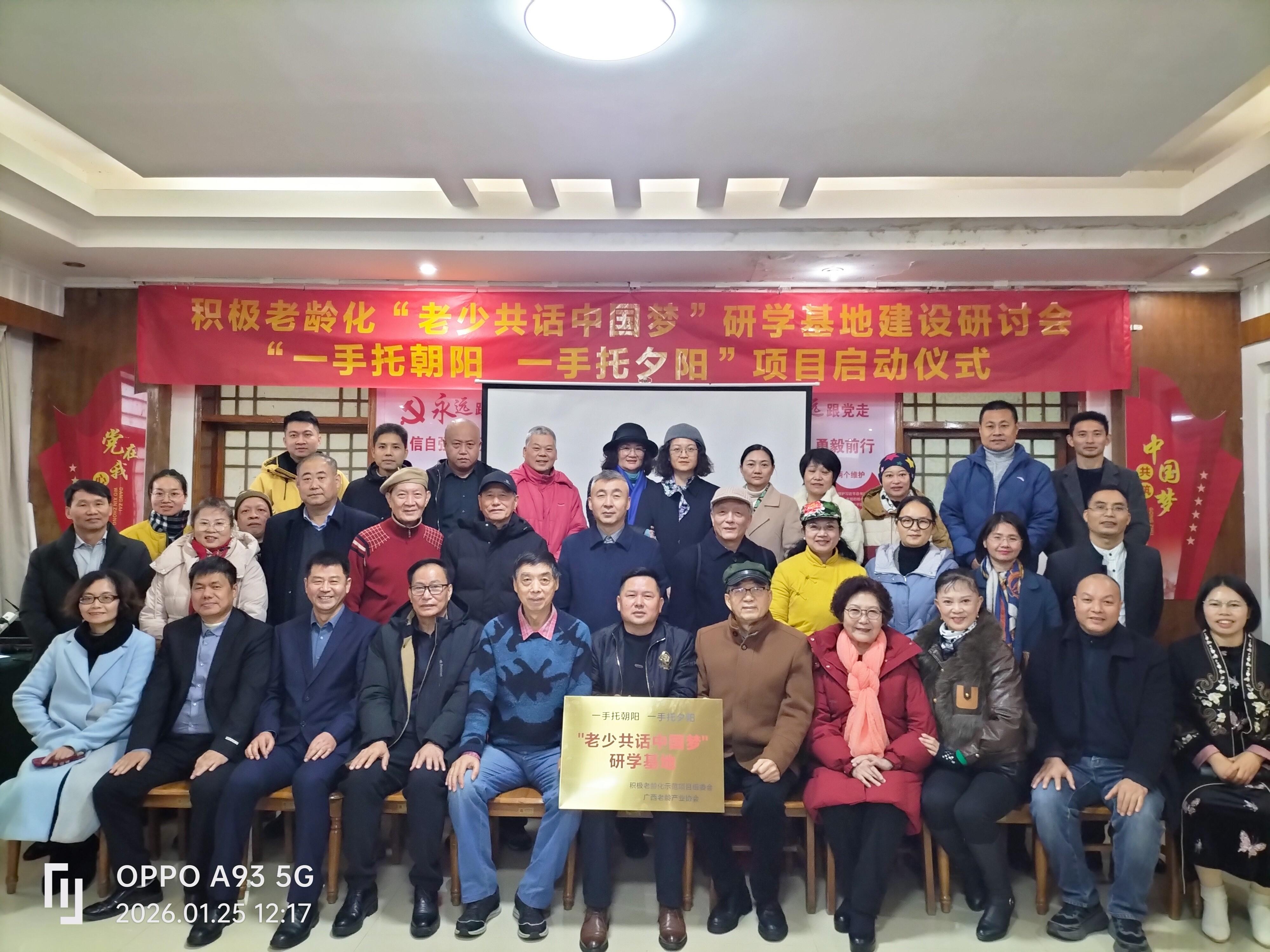 (南宁讯)1月25日,“积极老龄化‘老少共话中国梦’研学基地建设研讨会暨‘一手托朝阳一手托夕阳’项目启动仪式”在广西南宁“乡村大世界”正式举行。本次活动由广西老龄产业协会、北京青葵园科技有限公司、广西问心养老服务集团有限公司主办;广西老年基金会、广西文化产业协会、中国知青集团广西分会、广西慈善终端综合服务平台、广西巴马蓝色纽带公民互助合作联合会协办;北京智睿养老产业研究院、桂元纪文化集团提供学术支持。旨在探索积极老龄化实践路径,搭建代际沟通桥梁,通过研学基地建设,整合老年智慧与青年活力,共同描绘中华民族伟大复兴的中国梦新图景。