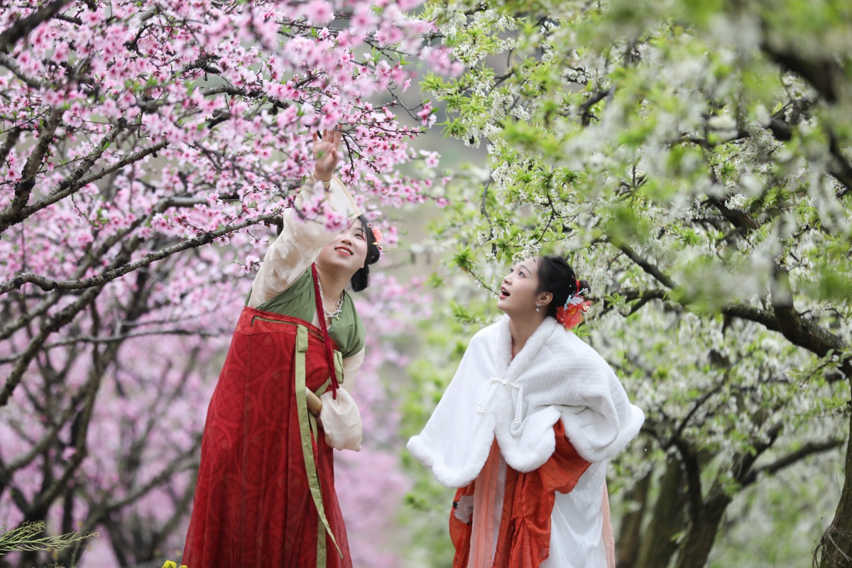 游客在柳州市柳江区里高镇的梨花林里拍照。柳江区文化体育广电和旅游局供图 与此同时,当地将梨园、油菜花田、圩场、养殖基地、产业园等串点成线,规划专属赏花赶圩路线,为游客打造“赶圩购特产+农活体验+美食品鉴”的一站式游玩体验。游客在赏花之余,可以体验养螺蛳、种桑养蚕等农事,品尝豆豉、米饼等本地风味,沉浸式感受乡土风情。 “每年3月梨花开,7月果成熟,都会吸引大批游客前来,春赏花、夏品梨的农业景观和特色采摘旅游模式深受青睐。”里高镇党委书记杜柱介绍,依托青花梨资源,当地通过“公司+基地+农户”联动,带动村民广泛参与旅游服务,走出一条农文旅融合发展新路子。 数据显示,今年3月以来,里高镇游客量较去年同期增长35%,核心观赏区接待游客超5万人次,赏花热潮直接带火圩日人气,当地小黄姜、土鸡蛋等土特产销量提升40%,豆豉、糯香米饼等非遗美食持续走俏,当地村民在家门口摆摊售卖特产,人均增收超千元。 “花香引来八方客,我们的生意也比平时更好,日子过得更有滋有味。”当地村民覃女士笑着说,“眼下花季逐渐过了,接下来就是夏果季节,到时这里会更热闹。” 柳州市柳江区里高镇的梨花开得正好。柳江区文化体育广电和旅游局供图 柳江区文化体育广电和旅游局局长刘江表示,一花一果皆是宝,当地将秉持“花季观光、果期采摘”的体验式发展模式,深挖农文旅融合潜力,串点成线打造全域赏花旅游路线,丰富旅游业态,推动乡村旅游从“一季热”向“四季旺”转变。 桂林市灵川县海洋乡 桃李芬芳人气旺 时下的桂林市灵川县海洋乡,桃花正红、李花雪白、杜鹃含苞待放,一幅“乱花渐欲迷人眼”的春日画卷正热烈铺展,成为踏青赏花的好去处。