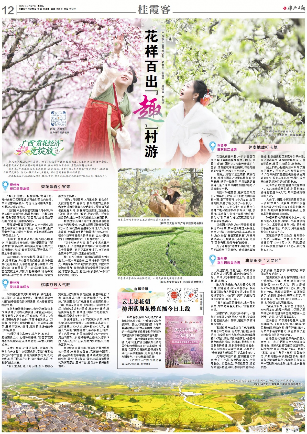 新闻眼春风拂八桂,沃野尽芳菲。时下,从桂中田园到桂北山区,从右江河谷到南岭余脉,各色繁花在广袤的乡村田野肆意绽放,各地游客纷至沓来,赏花热潮持续涌动。 视频制作:广西云-广西日报记者 何兴强(部分素材来源:灵川县文化广电体育和旅游局、富川瑶族自治县文体广电和旅游局、田东县文化体育广电和旅游局) 柳州市柳江区里高镇 梨花飘香引客来 “梨花白雪香,一枝春带雨。”每年3月,柳州市柳江区里高镇的万亩梨花如约绽放,如云似雪缀满枝头,与远山近村相映成趣,引得游人纷至沓来。 柳州市柳江区里高镇的万亩梨花如约绽放。柳江区文化体育广电和旅游局供图 “我们在网上看到盛花期在3月中旬,特意从南宁自驾过来,就是想领略一下梨花的美,感受春日好时光。”游客黄女士近日趁着花期,忙着在花前拍照留念。 里高镇种植青花梨已有20余年历史,目前全镇青花梨种植面积达1.6万余亩,是广西最大的青花梨生产基地,更是远近闻名的“青花梨之乡”。 近年来,里高镇以青花梨为核心吸引物,不断深挖多元价值,打造“梨园花语”“琴韵梨香”农旅品牌,并将赏花与青花梨产业深度绑定,形成“春天赏梨花、夏天品梨子”的全季特色体验。