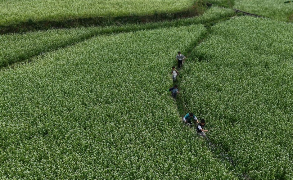 百色市田东县江城镇供固村,小朋友在荞麦花海中玩耍。 田东县文化体育广电和旅游局供图 花有了,人怎么来?田东县文化体育广电和旅游局局长苏华介绍,该县“以花为媒”,多措并举将“种庄稼”转化为“种风景”,推动赏花资源与乡村旅游深度融合。 以供固村为例,该村荞麦种植面积达350余亩,其中巴当屯连片种植上百亩,打造了规模化的赏花基底;同时,融入全县“春日赏花长廊”,与祥周镇油菜花、江城镇李花串珠成链,形成了“四季有花、处处有景”的格局。 为了让游客“进得来、路好走”,村里把路修到了花田边。针对周末客流高峰,村委组织党员志愿者引导分流,优化游览路线,新增临时停车场,让游客进得来、停得下、玩得好、还想来。 百色市田东县江城镇,蜜蜂在荞麦花间飞舞。田东县文化体育广电和旅游局供图 线上的风,也把供固村吹向了更远的地方。网红达人扛着设备来打卡,“花开供固”主题短视频播放量突破100万,荞麦花海迅速“出圈”,成为周边市民短途游的热门打卡地。 花海的引流效应直接体现在数据上。2026年春季赏花季,供固村日均接待游客超500人次,周末高峰突破2000人次。 人来了,供固村便围绕荞麦花进一步做“文章”。收获期,农户不仅直接卖荞麦,还把荞麦加工成荞麦糊、荞麦面、荞麦风味披萨等特色食品,让游客品尝地道的春天味道。 种植户蒙利师便是其中之一。他制作的荞麦粉虫,常常一出锅便被抢购一空。靠着这道特色小吃,蒙利师日收益最高可达180多元,月收益更是稳定在5400元左右。 赏花经济的带动效应,辐射整个田东县。今年第一季度,田东县预计接待游客128.95万人次,同比增长13.06%;旅游总消费11.83亿元,同比增长12.51%。 贺州市富川瑶族自治县 油菜田变“大景区” 风过富川,田埂泛金。成片的油菜花与古村民居、黛色远山贴在一起。风动,花香裹着泥土气,漫过田埂,飘进村口。