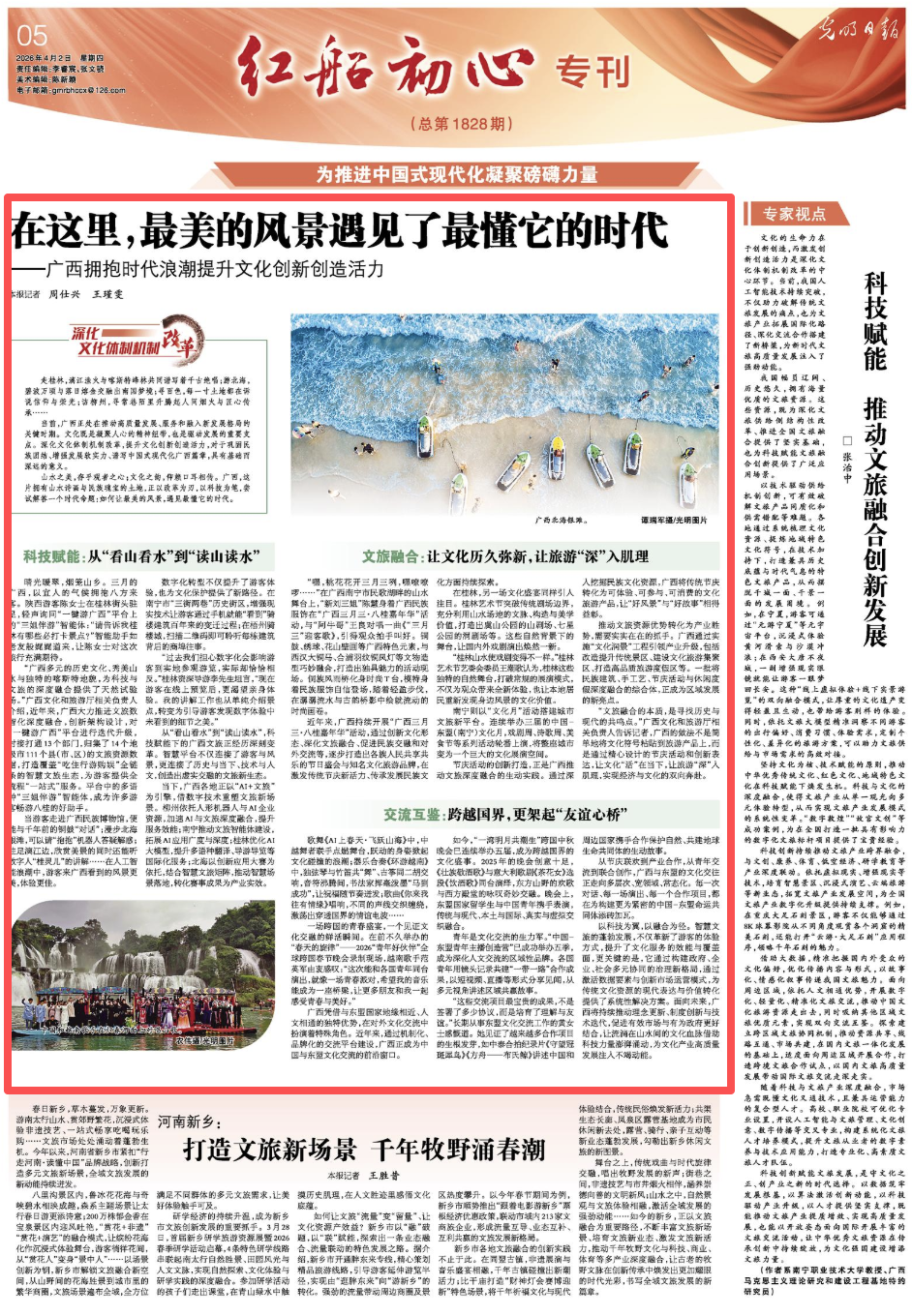 4月2日,《光明日报》刊发文章《在这里,最美的风景遇见了最懂它的时代——广西拥抱时代浪潮提升文化创新创造活力》,全文内容如下: