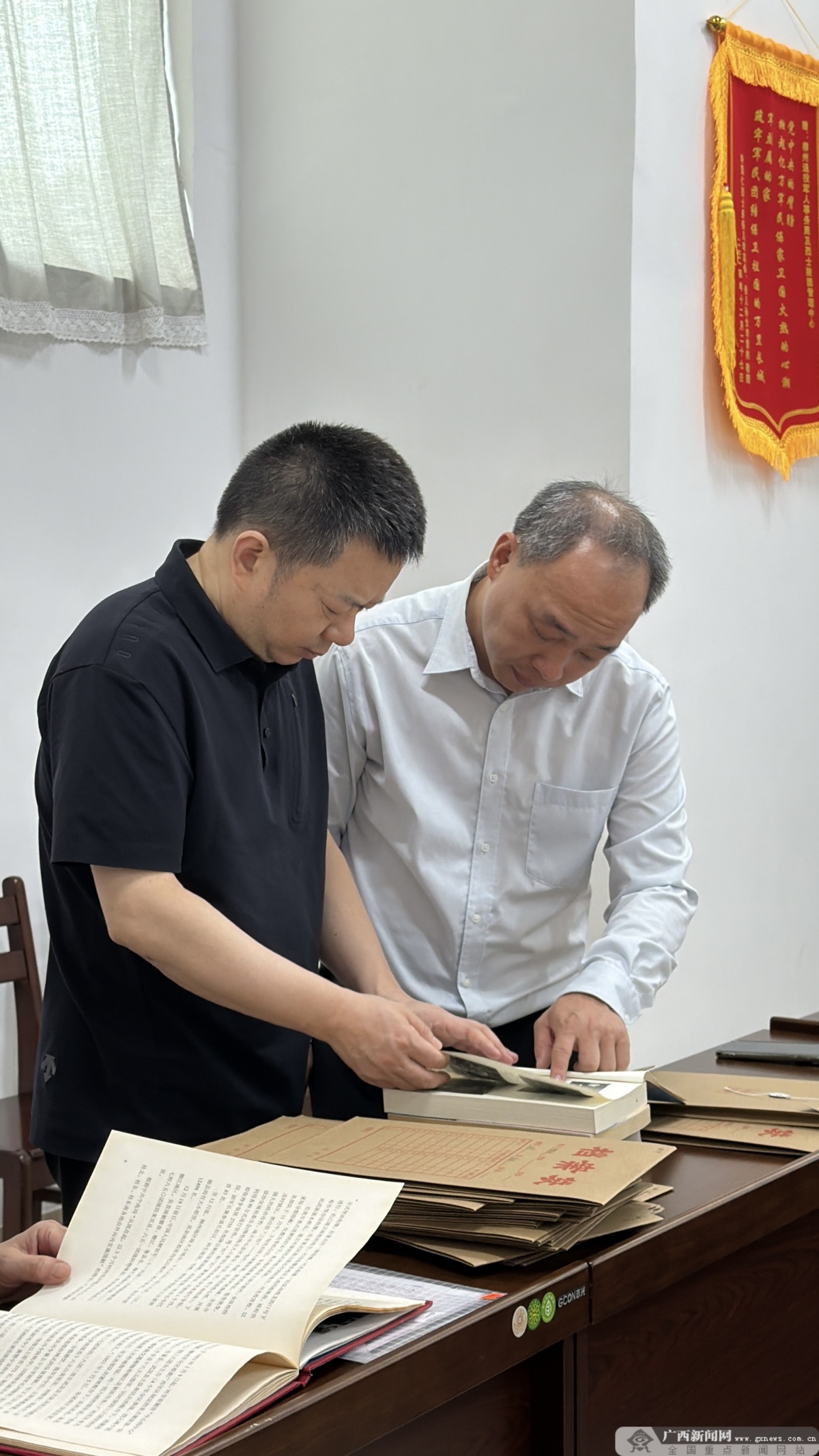 辽宁日报社总编辑张小龙(左一)与柳州市烈士陵园管理中心主任黄斌杰(右一)一起翻阅辽宁籍烈士的资料。广西云-广西日报记者 何俊涛 唐绍怡 摄