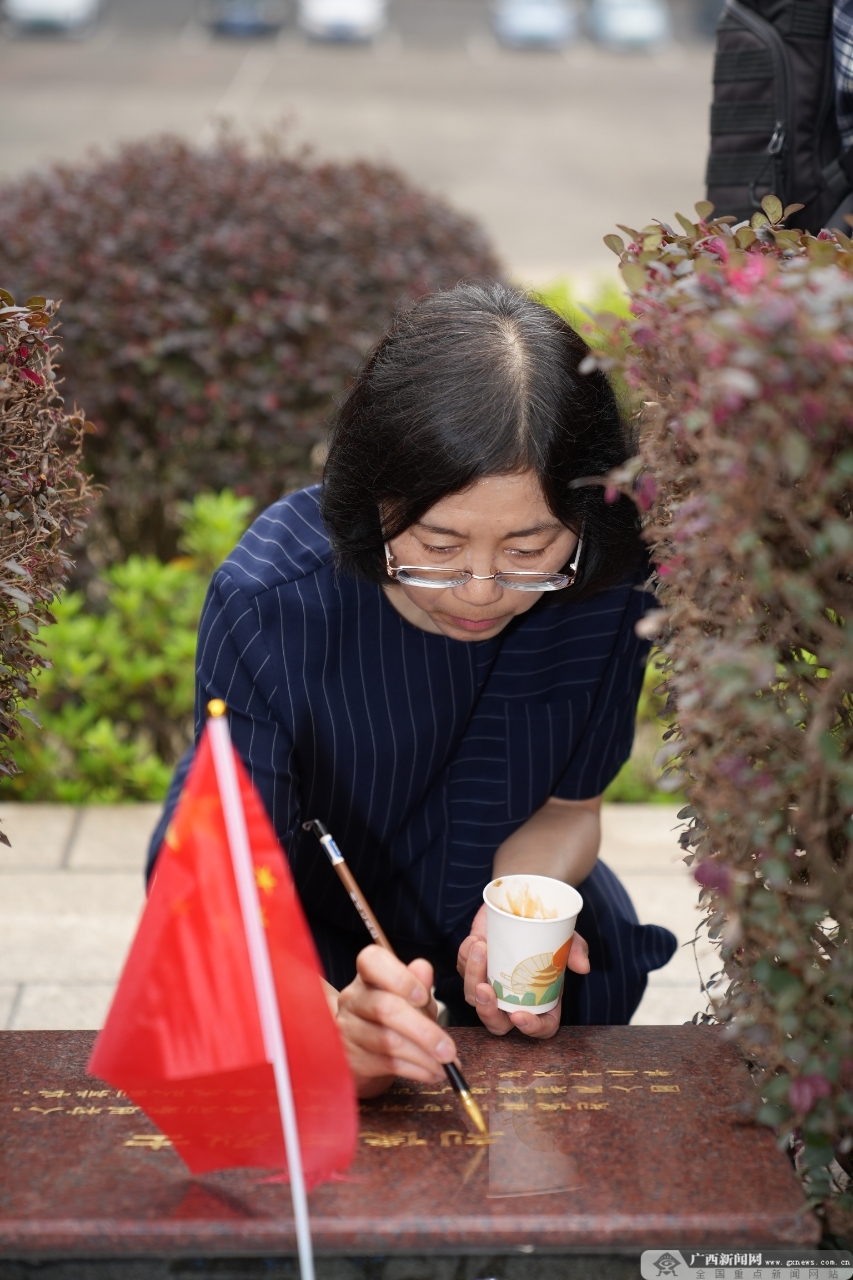 辽宁日报社副总编辑柏岩英为烈士墓碑描金。广西云-广西日报记者 何俊涛 唐绍怡 摄